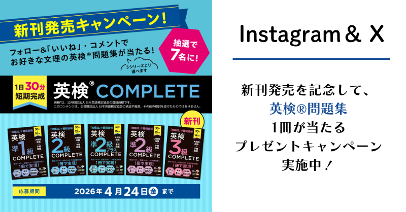 【公式】パパママ応援隊!アカウント(@bunri.official)または文理@勉強垢【公式】アカウント(@bunri_study)をフォローして、 「英検®COMPLETE」のキャンペーン投稿に対して「いいね」と「コメント」をしてくださった方の中から、 抽選でそれぞれ7名、合計14名の方にお好きな文理の英検®教材1冊をプレゼント プレゼント 当選者に後日DMで欲しい教材をお尋ねさせていただきます。 下記から1点お選びください。 ①「英検®COMPLETE」シリーズ(5点)から1点 ②「わからないをわかるにかえる英検® 問題集」シリーズ(6点)から1点 ③「わからないをわかるにかえる英検® 単語帳」シリーズ(5点)から1点 ※英検®は、公益財団法人 日本英語検定協会の登録商標です。 ※このコンテンツは、公益財団法人 日本英語検定協会の承認や推奨、その他の検討を受けたものではありません。 応募方法 Instagramでの応募の場合 STEP1:文理【公式】パパママ応援隊!アカウント(@bunri.official)をフォローする。 STEP2:投稿に「いいね」 STEP3:投稿に対してコメント Xでの応募の場合 STEP1:文理@勉強垢【公式】アカウント(@bunri_study)をフォロー STEP2:投稿に「いいね」 STEP3:投稿に対してコメント Instagram(@bunri.official) X(@bunri_study) 応募締切 2026年4月24日(金)23:59 抽選・発表 ・応募期間終了後、抽選によって当選者を決定いたします。 ・当選発表は2026年4月下旬頃、当選された方へのInstagramまたはXのダイレクトメッセージ(DM)をもってかえさせていただきます。 ・応募者ご本人様の都合により当選の連絡ができない場合、また当選連絡後、2日以内にご返信がない場合は、当選を無効とさせていただきます。 ・「なりすましアカウント」にご注意ください。 ・プレゼントの発送は4月下旬頃を予定しております。なお、プレゼントの発送は国内に限定させていただきます。 ※Instagramの文理【公式】パパママ応援隊!アカウント(@bunri.official)またはXの文理@勉強垢【公式】アカウント(@bunri_study)以外からDMをお送りすることは一切ございません。 ※当選者様にクレジットカード番号や暗証番号等をお聞きすることはございません。 ※なりすましアカウントと思われる不審なDMを受け取った場合は速やかにそのDMを削除し、被害防止のために当該アカウントのブロックをお願いいたします。 お問い合わせ 下記フォームからお問い合わせください。 お問い合わせ 応募規約 Intagram版 文理 「英検®COMPLETE」発刊キャンペーン 規約 ■募集期間2026年4月15日(水)~2026年4月24日(金)23:59迄 ■応募資格利用規約に同意していただいた日本国内に在住の方ならどなたでも応募可能です。(Instagramの利用制限に則り、13歳未満の方からのご応募はお断りしております) ■応募方法・STEP1:文理【公式】パパママ応援隊!アカウント(@bunri.official)をフォローする。・STEP2:投稿に「いいね」・STEP3:投稿に対してコメント ■プレゼントの内容当選者7名の方に文理発刊の下記英語教材の中からいずれかをプレゼントいたします。(当選された方にプレゼントをお選びいただきます)。・①「英検®COMPLETE」シリーズ(5点)から1点・②「わからないをわかるにかえる英検® 問題集」シリーズ(6点)から1点・③「わからないをわかるにかえる英検® 単語帳」シリーズ(5点)から1点※英検®は、公益財団法人 日本英語検定協会の登録商標です。※このコンテンツは、公益財団法人 日本英語検定協会の承認や推奨、その他の検討を受けたものではありません。 ■当選およびプレゼントの発送について・応募期間終了後、抽選によって当選者を決定いたします。・当選発表は2026年4月下旬頃、当選された方へのInstagramのダイレクトメッセージ(DM)をもってかえさせていただきます。・応募者ご本人様の都合により当選の連絡ができない場合、また当選後、2日以内にご返信がない場合は、当選を無効とさせていただきます。・「なりすましアカウント」にご注意ください。・プレゼントの発送は4月下旬頃を予定しております。なお、プレゼントの発送は国内に限定させていただきます。※Instagramの文理【公式】パパママ応援隊!アカウント(@bunri.official)以外のアカウントからDMをお送りすることは一切ございません。※当選者様にクレジットカード番号や暗証番号等をお聞きすることはございません。※なりすましアカウントと思われる不審なDMを受け取った場合は速やかにそのDMを削除し、被害防止のために当該アカウントのブロックをお願いいたします。 ■個人情報の取り扱いについてキャンペーンにご応募いただいた時点で、株式会社文理(以下、「当社」といいます)の定める個人情報保護方針にご同意いただいたものとみなします。詳しくは、当社の定める「個人情報の取扱いについて」(https://www.bunri.co.jp/privacy)をご覧ください。 ■本キャンペーンに関するお問い合わせInstagramの文理【公式】パパママ応援隊!アカウント(@bunri.official)のDMにてお申し出ください。なお、プレゼントに関するご質問、当選に関するお問い合わせにはお答えいたしかねます。 ■その他