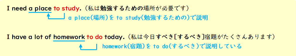 不定詞が直前の名詞を説明し、「~するための」「~すべき」を表します。
