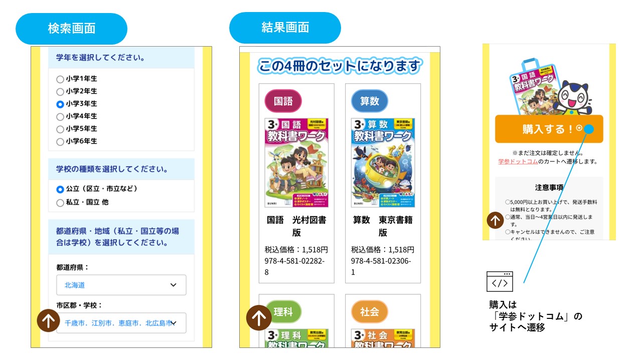 使用教科書サーチ同様、「学年」「学校の種類」「都道府県」「市区郡・学校」を選択するだけで、お子様の学校あった教科書ワークセットを検索できます。