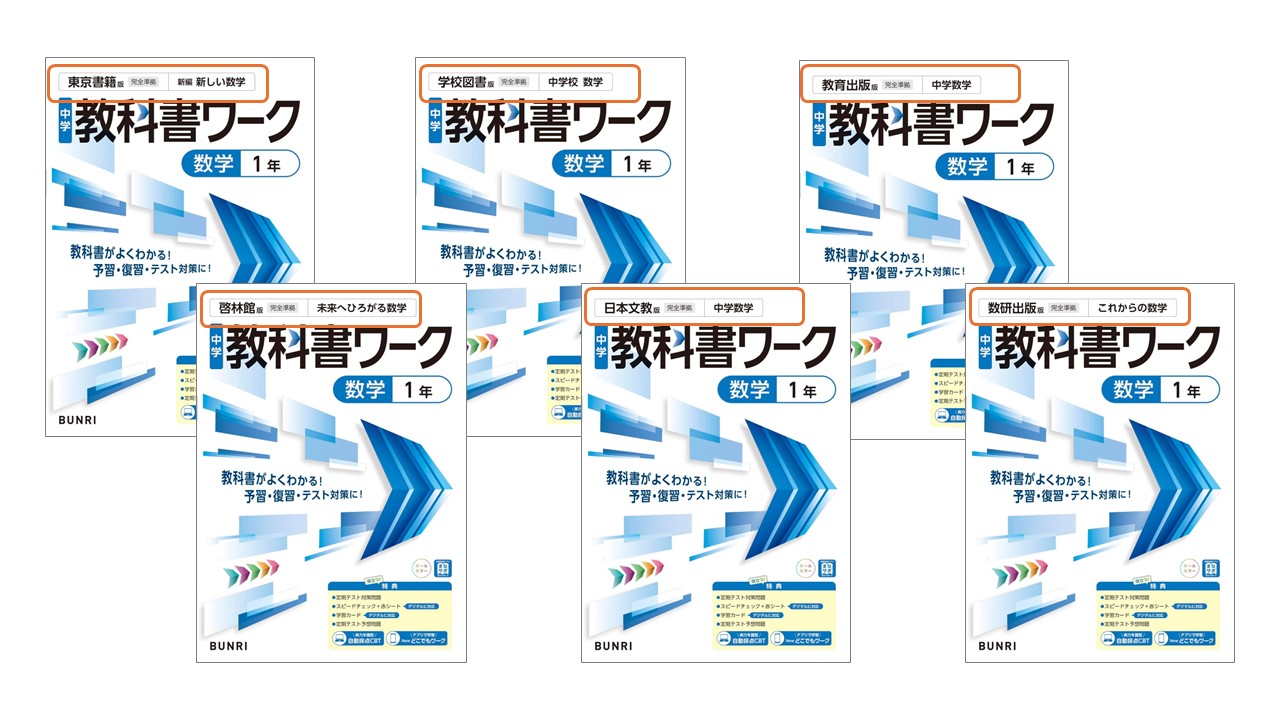 ▲「中学教科書ワーク 数学1年」の表紙デザイン。一見して同じデザインに見えるが、教科書銘柄が記載されている。