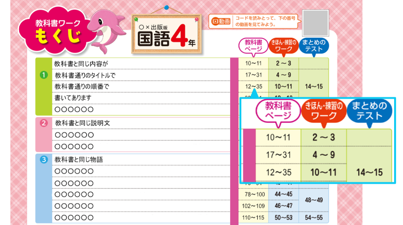 ▲「教科書ワーク」のもくじは、教科書の単元名と同じで、順番もそのとおり。教科書の対応するページもひと目でわかる。(※画像はイメージ)