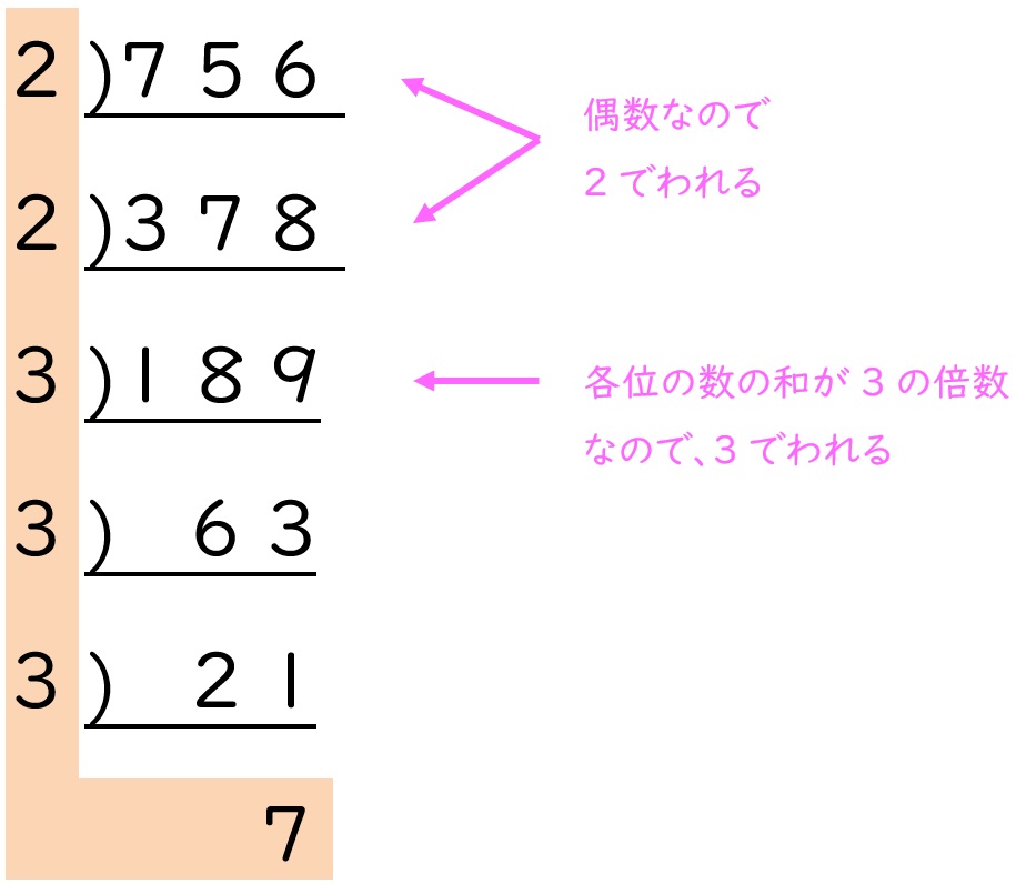 小さな素数「2」や「3」でわり切れるかを確認しながら進めましょう。