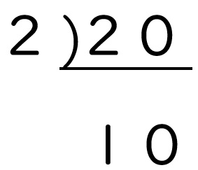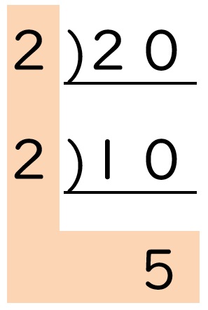 L字の左側にわった素数の「2」を書き、下側にわり算の答え(商)である「10」を書きます。