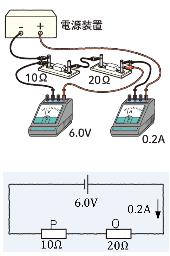 ❶より、P、Qのどちらにも0.2Aの電流が流れるので、オームの法則を用いると、