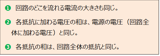 直列回路では、次の❶~❸のことがらが成り立ちます。