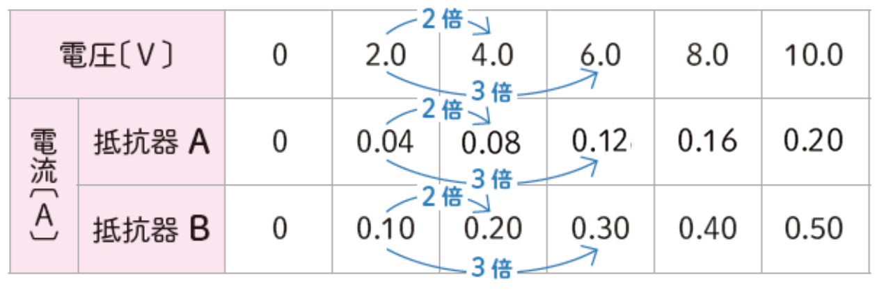 抵抗器A、抵抗器Bのどちらの場合でも、加わる電圧の大きさが2倍、3倍、…となると、流れる電流の大きさも2倍、3倍、…となっていることがわかります。