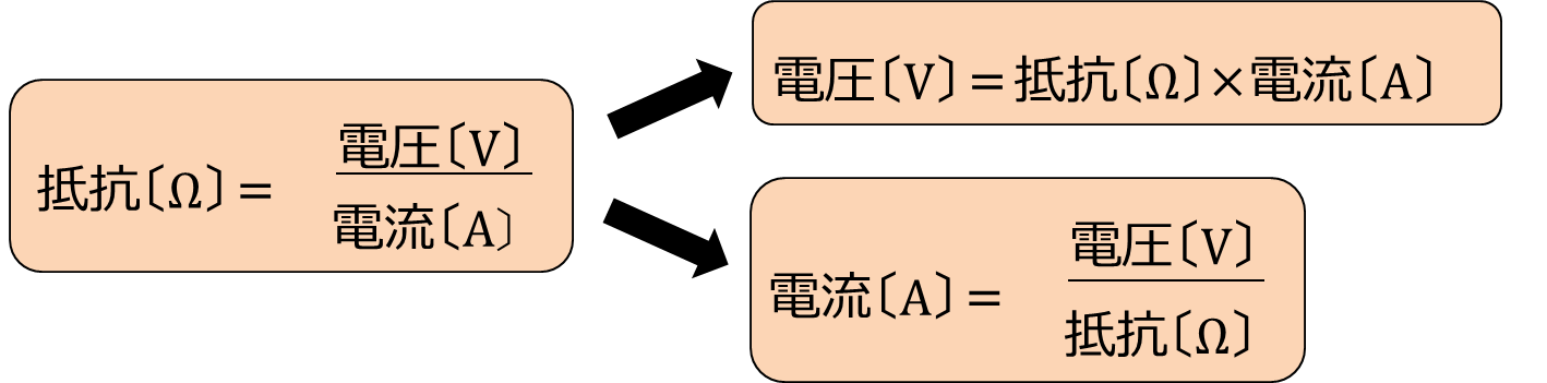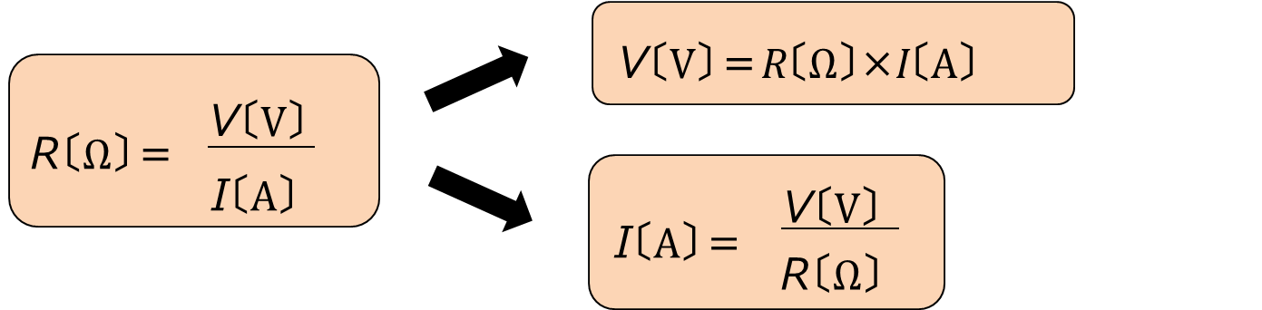 この3つの式こそが、オームの法則を表した式です。電圧をV〔V〕、電流をI〔A〕、抵抗をR〔Ω〕とすると、
