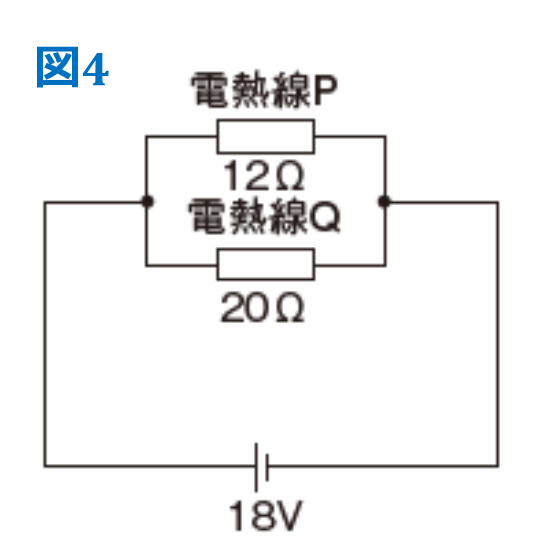 図4のように、12Ωの電熱線Pと20Ωの電熱線Qを並列につないだ回路に、18Vの電圧を加えた。