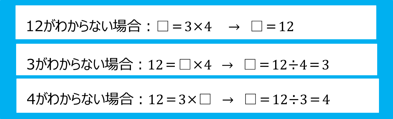 12=3×4の式の3つの数のうち、どれか1つがわからない場合、そのわからない数の求め方は次の通りですね!