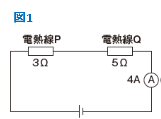 図1のように、3Ωの電熱線Pと5Ωの電熱線Qを直列につないだ回路に電圧を加えたところ、電流計は4Aを示した。