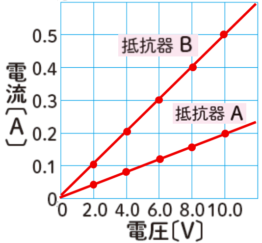 同じ10.0Vの電圧を加えたとき、抵抗器Bには0.50Aの電流が流れますが、抵抗器Aには0.20Aしか流れません。