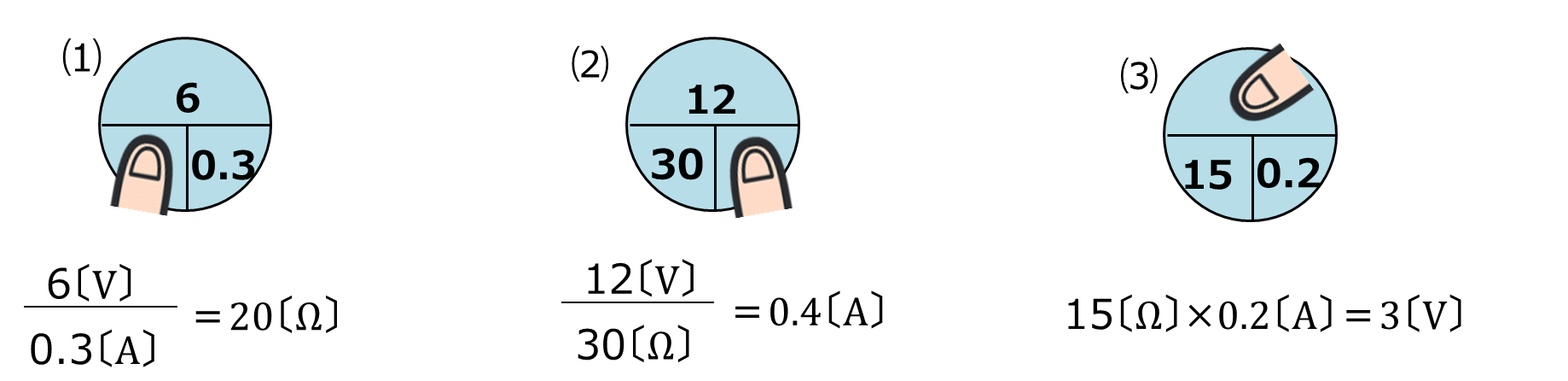 ▢〔V〕=15〔Ω〕×0.2〔A〕、 ▢=15×0.2=3〔V〕