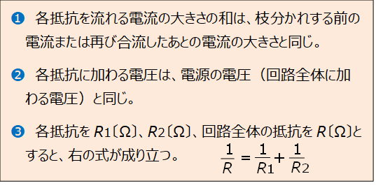 並列回路では、次の❶~❸のことがらが成り立ちます。