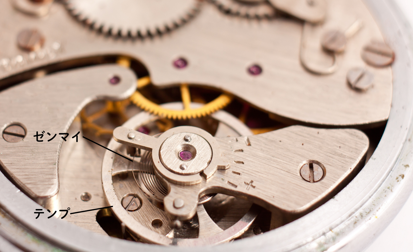 - テンプ:一定のリズムで振動し、歯車が進むタイミングを制御する重要パーツ。